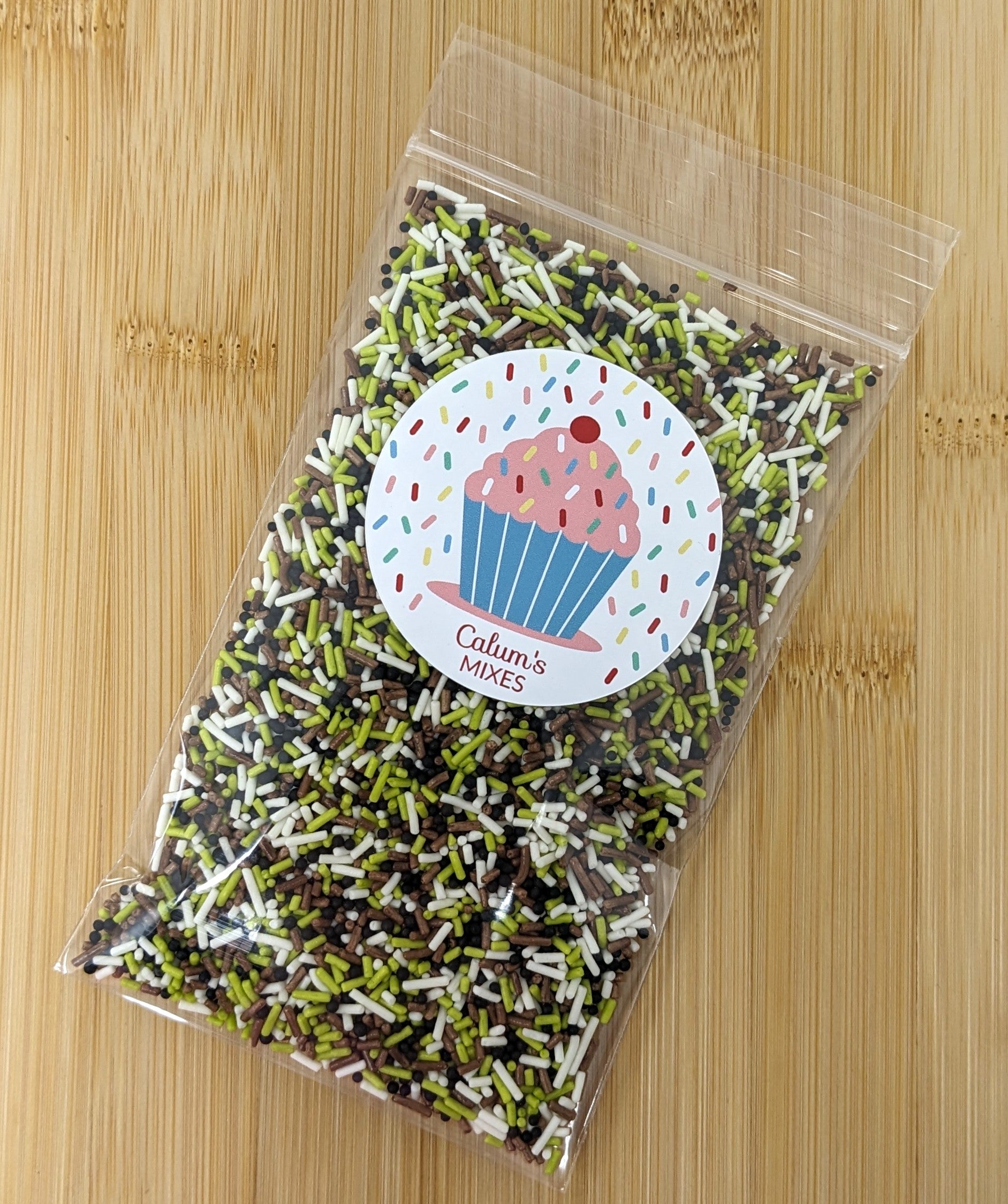This mix includes sugar strands and 100s and 1000s in green, black, brown, and white - perfect for sprinkling on cakes, biscuits or cupcakes.